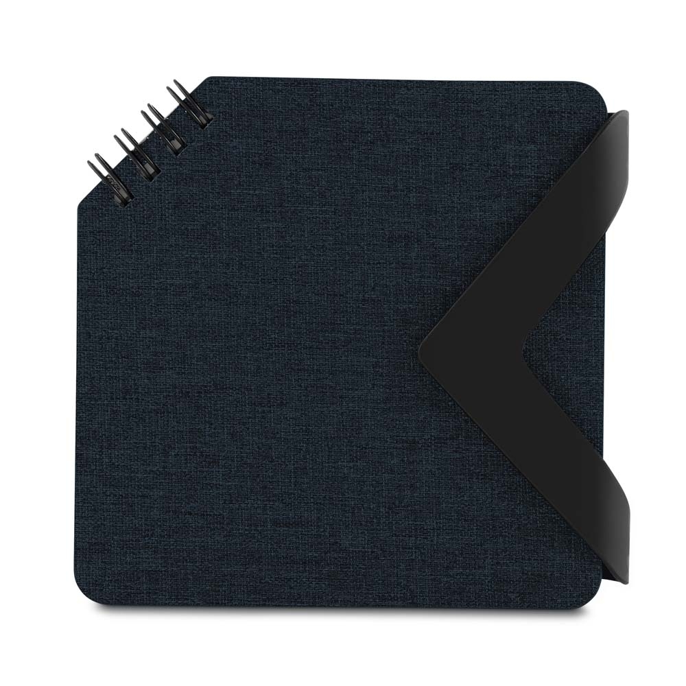 Bloco de anotações com capa dura em rPET, encadernação Wire-O e tira em couro sintético com fecho magnético. Possui aproximadamente 70 folhas pautadas.