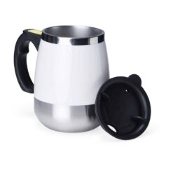 Caneca isotérmica com misturador de bebida, parte interna feita em inox parede dupla com capacidade de 350ml, acabamento colorido em plástico. Contém tampa plástica com bocal e trava de segurança. Para o funcionamento, utiliza-se duas pilhas AAA (não acompanha).