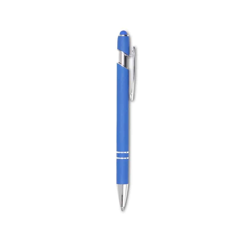 Caneta touch screen metálica com acabamento inteiramente emborrachado, carga esferográfica preta e acionamento por clique.
