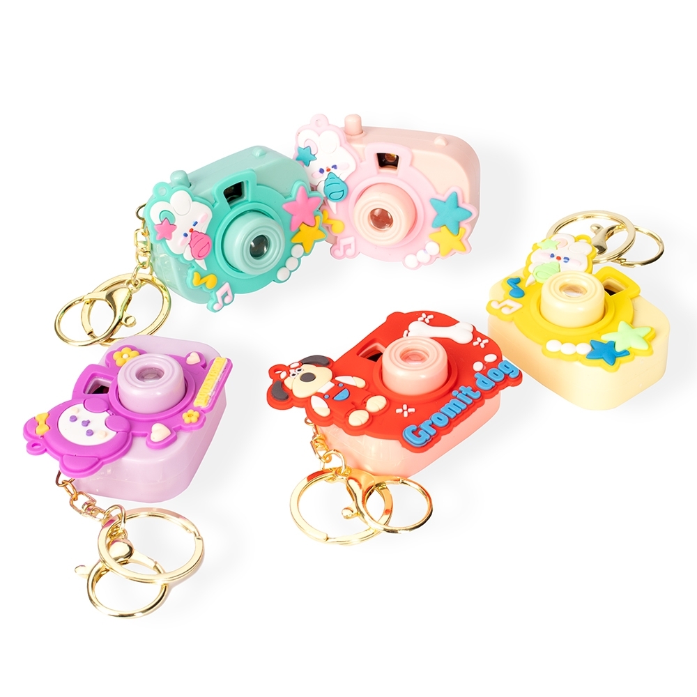 Chaveiro em plástico no formato de câmera, com detalhes decorativos de animais. Possui projeção de oito figuras de animais, acionada por botão, além de argola e mosquetão em metal. Acompanha três baterias L736 já embutidas.