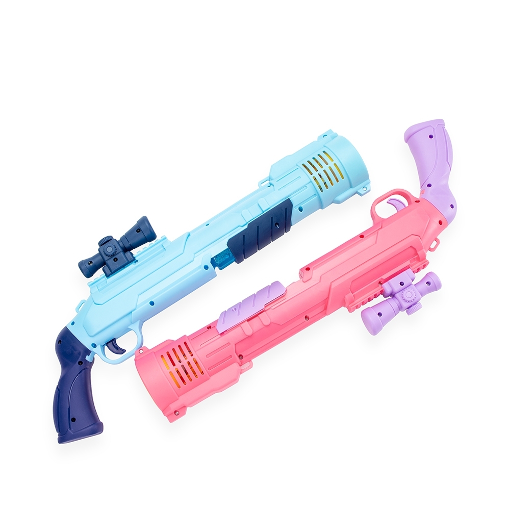Brinquedo lançador de bolhas de sabão com estrutura feita em plástico. Com o frasco de líquido acoplado, dispara múltiplas bolhas ao acionar o gatilho, que ativa o mecanismo de lançamento alimentado por quatro pilhas AA (não inclusas). Acompanha dois frascos líquido para formar bolhas e uma alça removível em nylon com mosquetões plásticos.